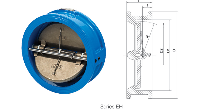 EH Series Dual plate wafer check valve?is with two torsion springs added to each of pair valve plates, which close the plates quickly and automatically, that can prevent the medium from flowing back.The check valve can be installed on both horizontal and vertical direction pipelines.